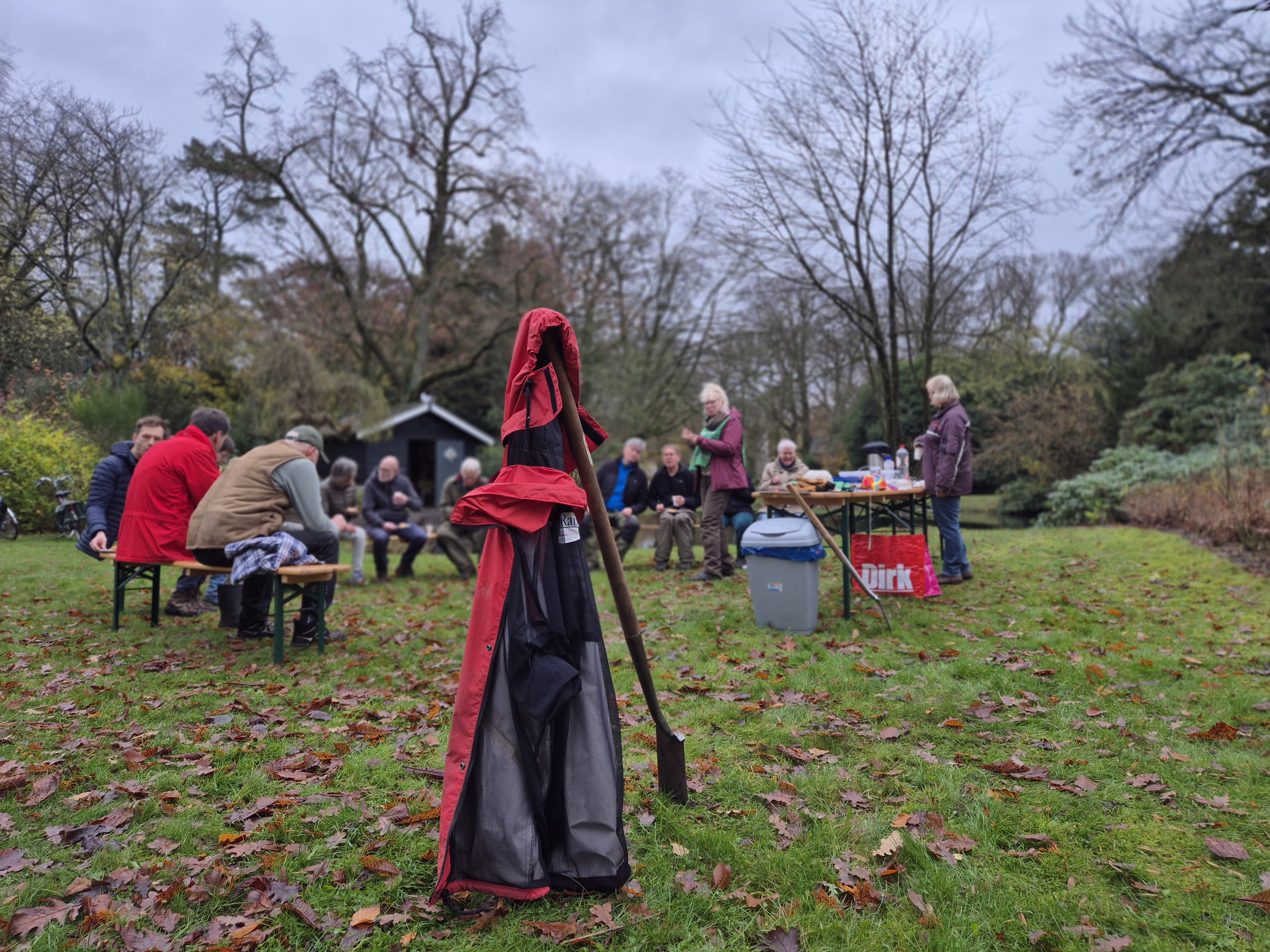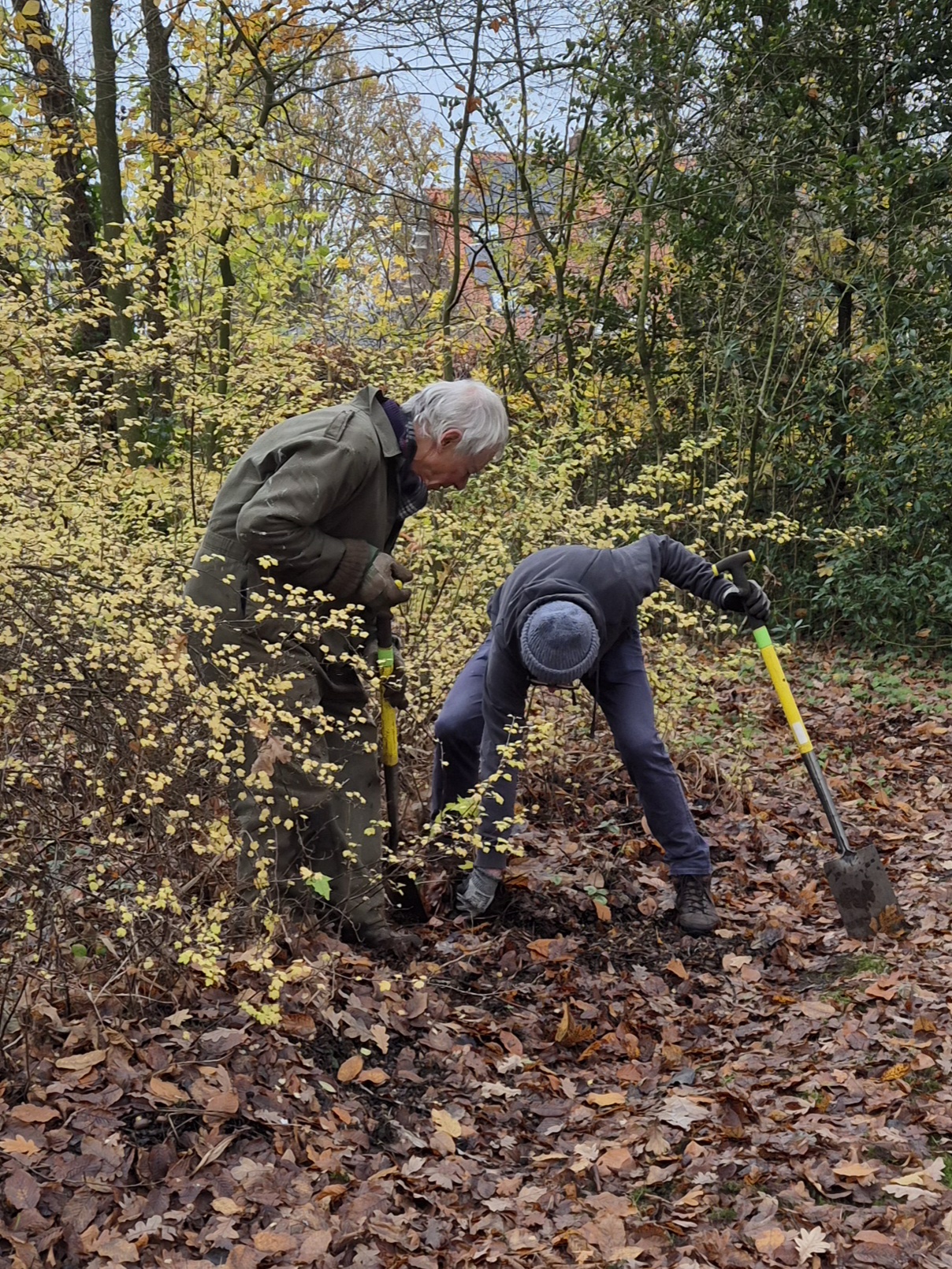 Op 29 november gingen we onder de vrolijke en deskundige begeleiding van Renée Elzinga van de Stichting Meer Bomen Nu aan de slag in het park. Alle kleine boompjes, van knie- tot manshoogte, mochten worden uitgegraven. Daarna werden ze gesorteerd en per 5 of 10 stuks bij elkaar gebonden. Aan het eind van de ochtend werden alle zaailingen opgehaald en vervoerd naar de bomenhub Eilandsteede in Kanaleneiland, waar ze op een later moment gratis opgehaald mogen worden.